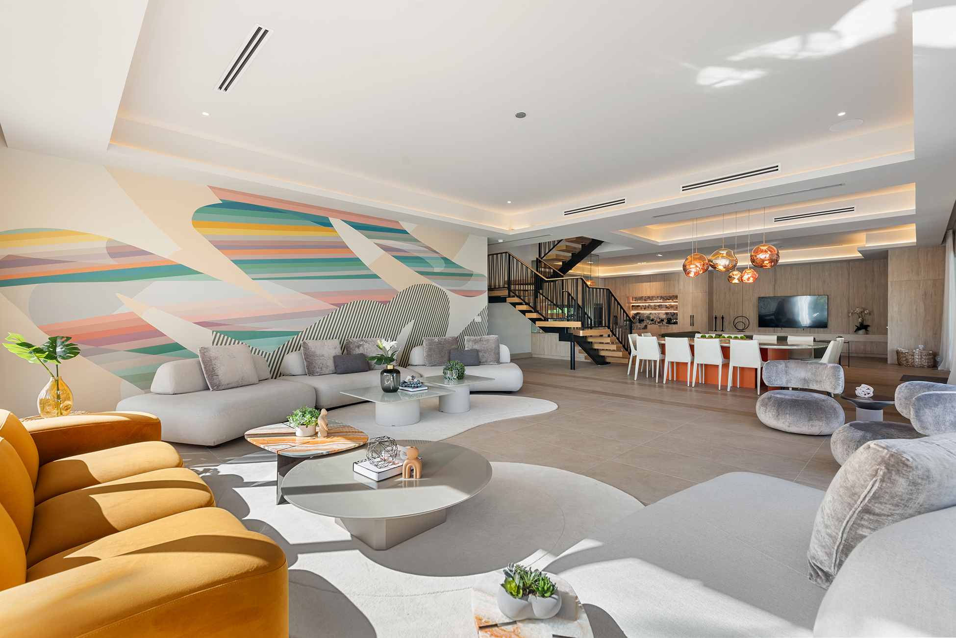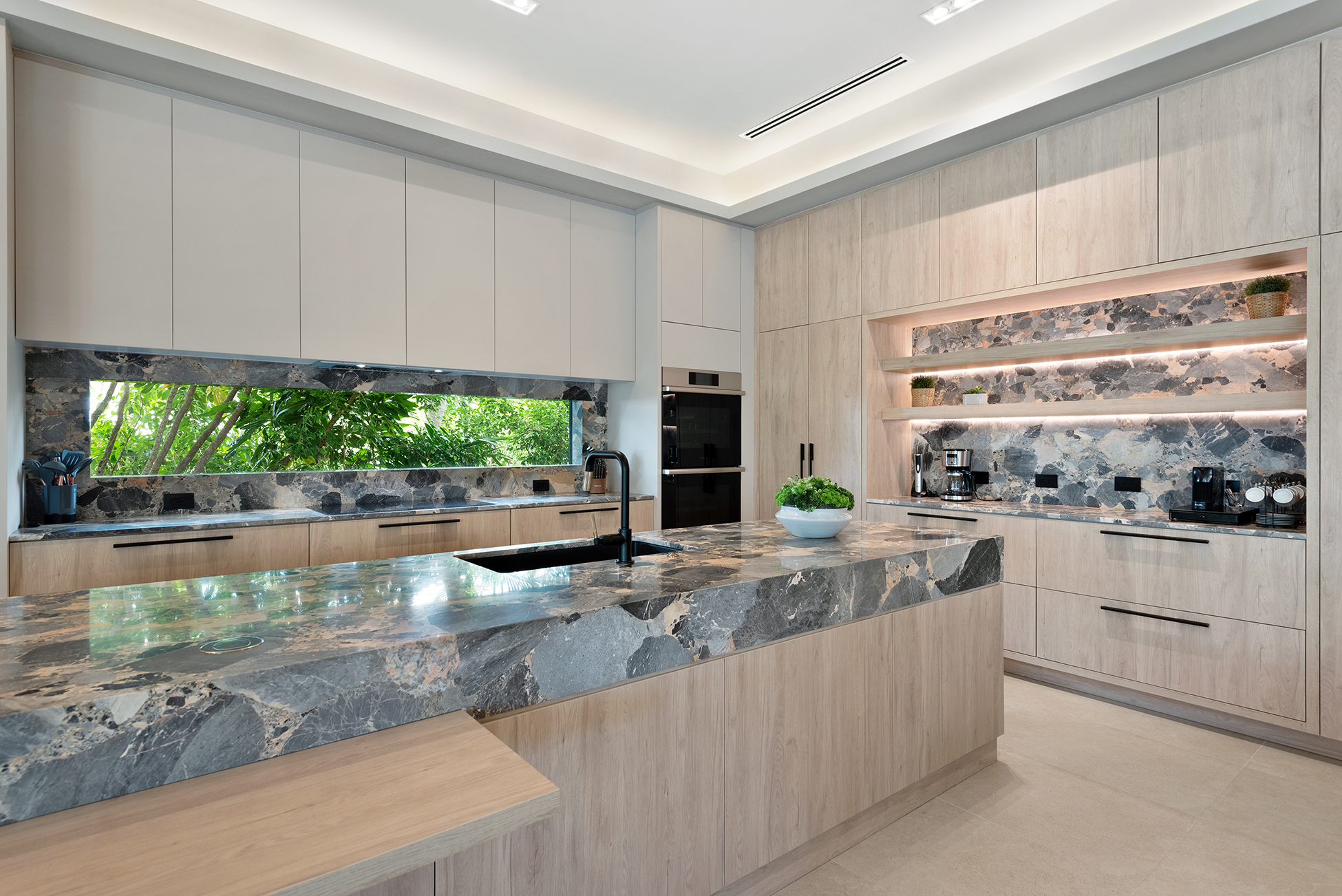 Terrazzo floors and flagstone surfaces introduce tactile durability, while oak interiors soften the palette. Natural stone and breeze blocks reference regional mid-century language without feeling outdated. The landscape design allows plantings to cascade along façade edges, blurring boundaries between built form and environment.