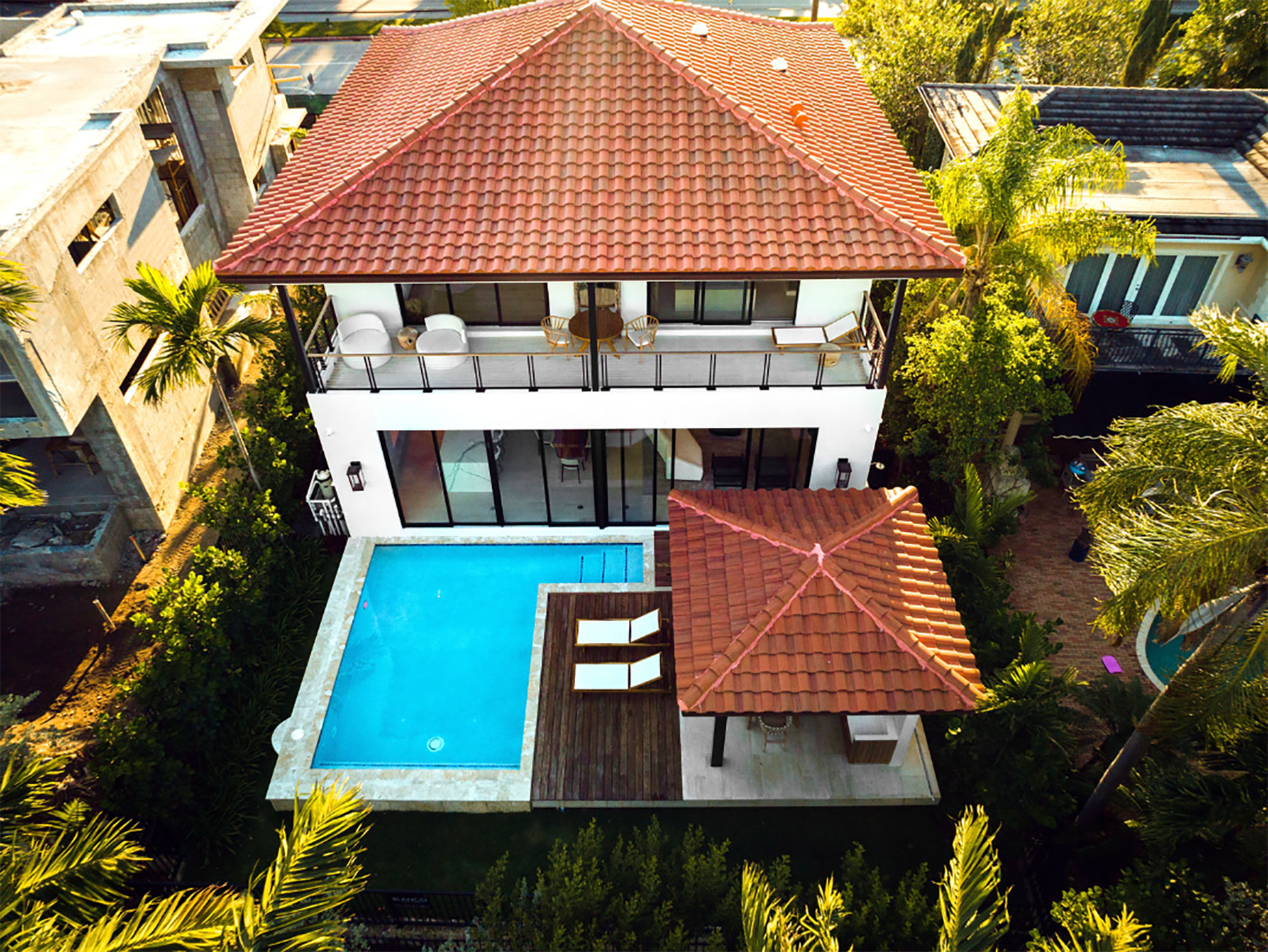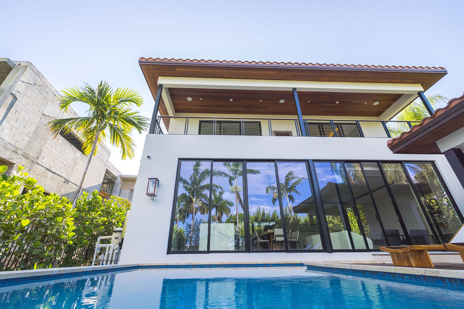 This Spanish Colonial reinterpretation incorporates restrained modern elements, striking a balance between the two architectural styles. The integrated pool blurs the boundary between kitchen, terrace, and water.