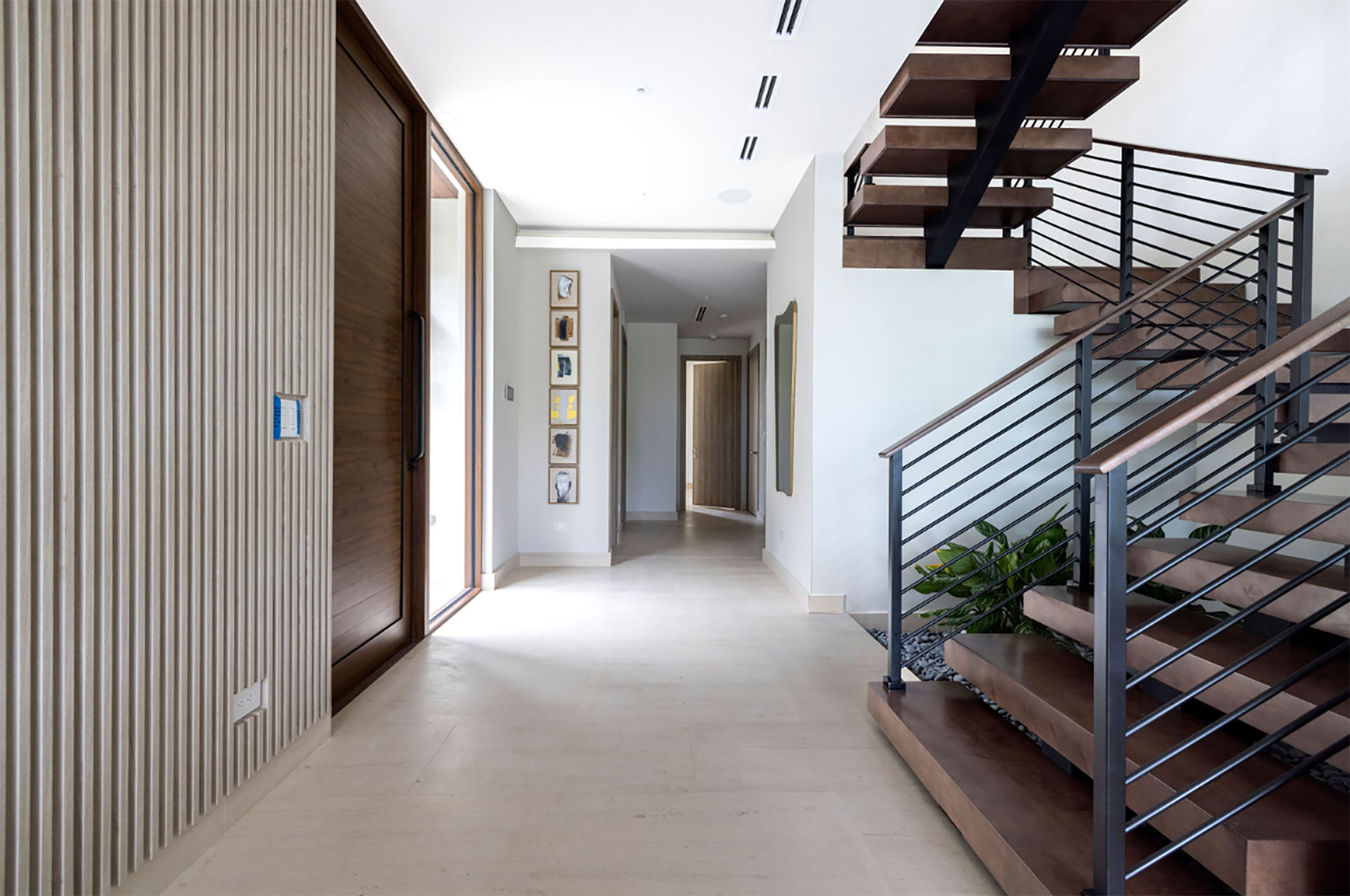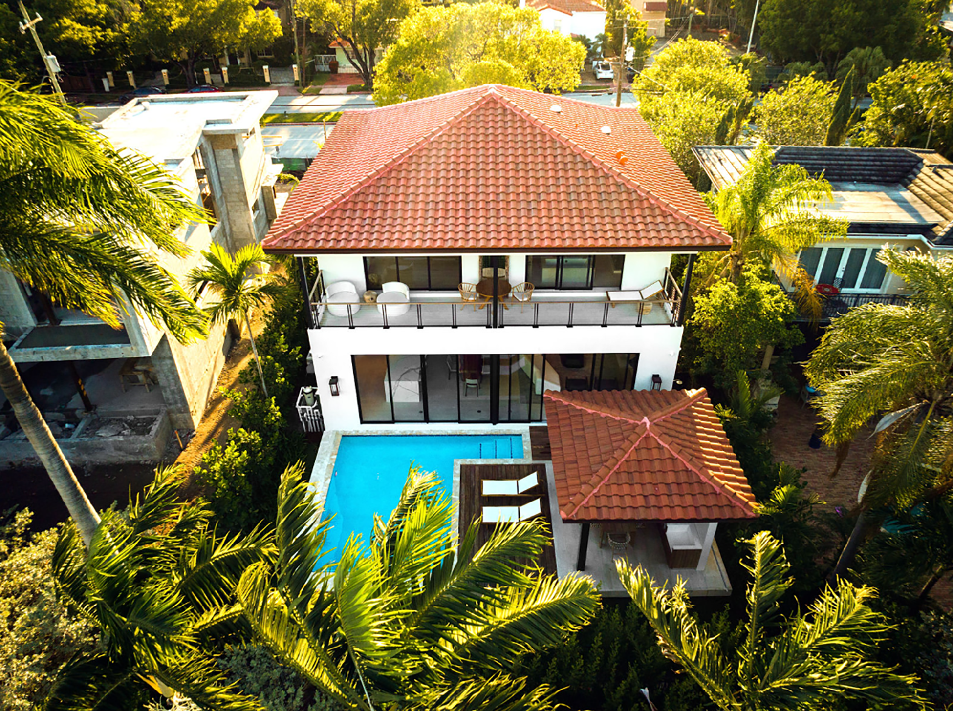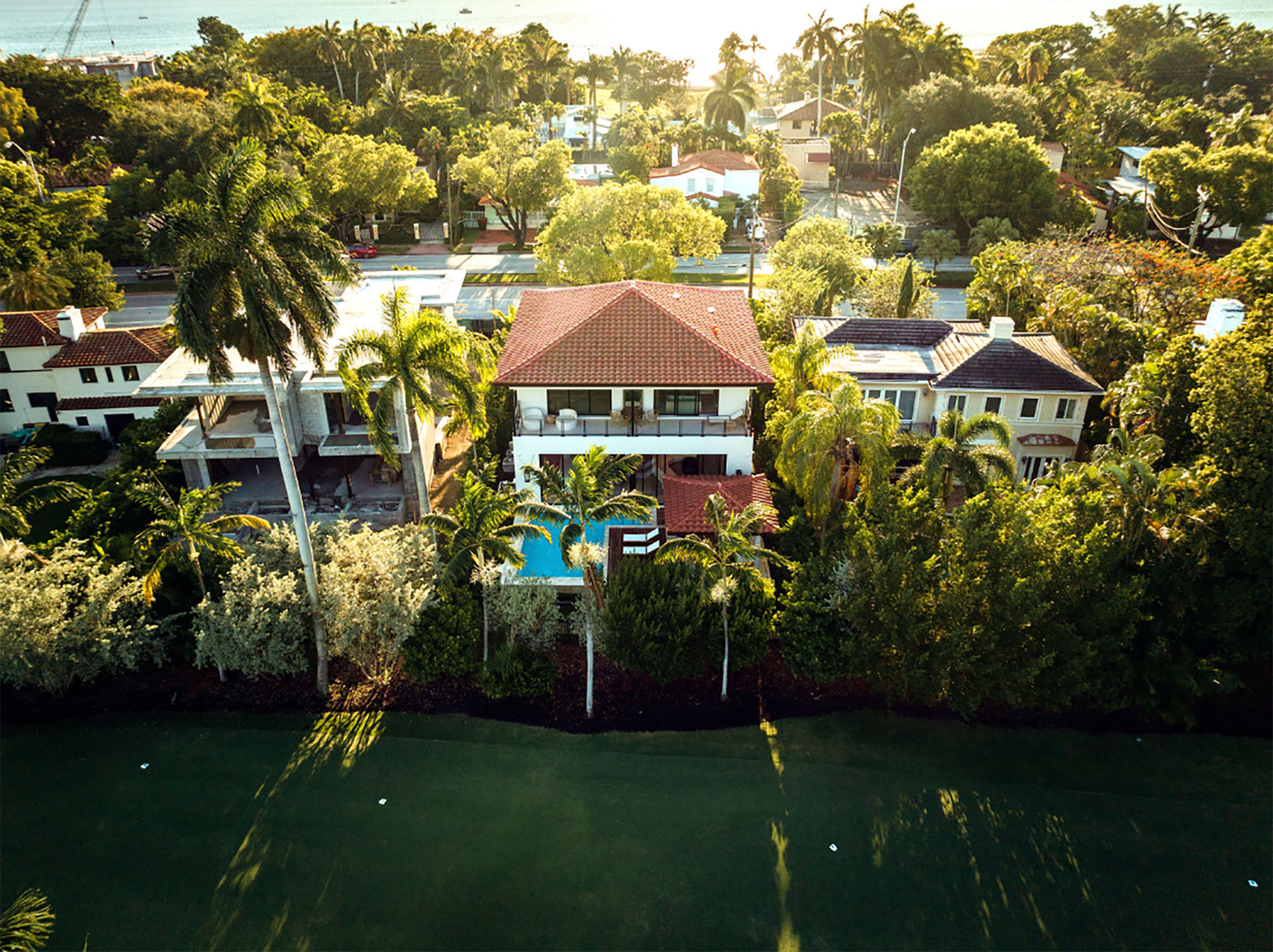 Casa Encanto sits on a narrow 7,125-square-foot lot adjacent to La Gorce Country Club, where density demands precision. Rather than appear compressed, the residence uses verticality to create openness within constraint.