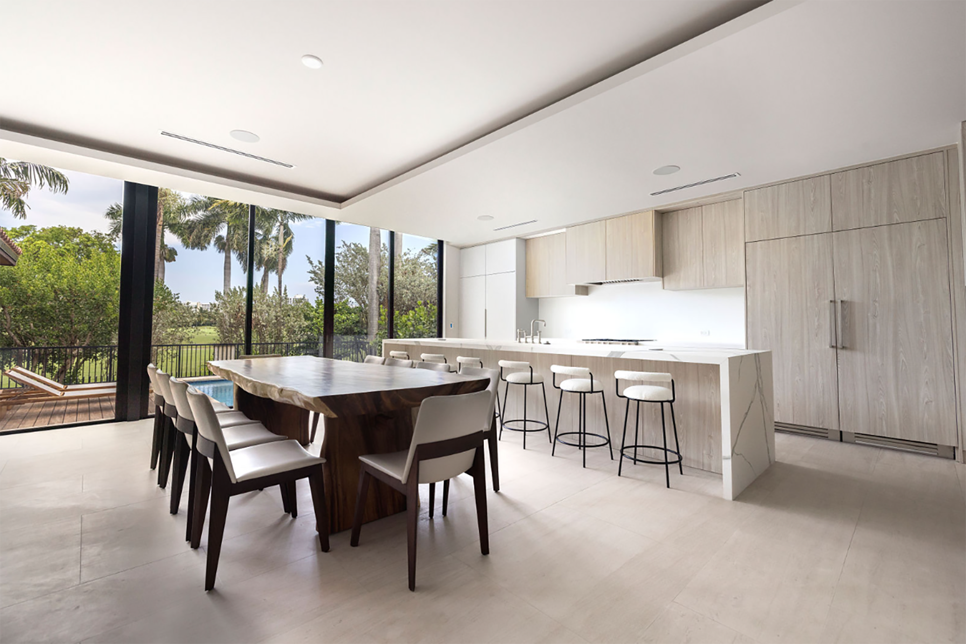 The defining element is the pool’s proximity to the main living space. Sliding glass walls open directly from the kitchen and living area to the water’s edge, dissolving interior and exterior boundaries, and requiring careful coordination of elevations and waterproofing.