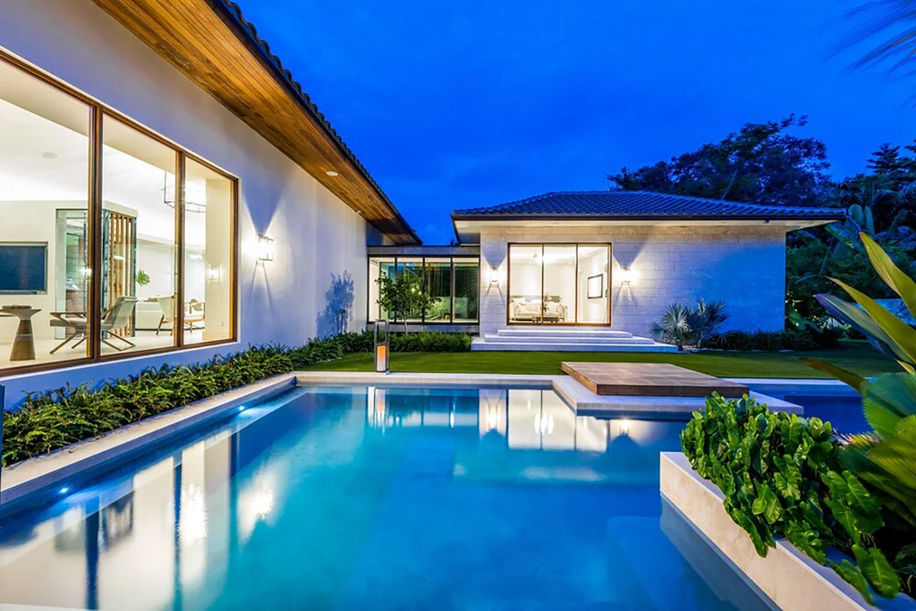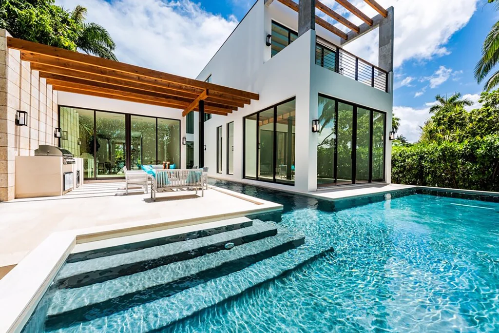 A waterfront residence defined by openness, coral stone textures, and expansive glazing. Clean modern lines are softened by rich wood interiors and coastal material warmth.